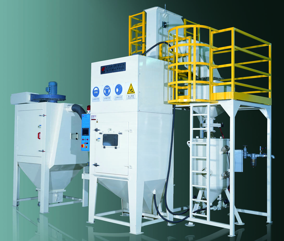 2?丸料和壓縮空氣的混合過程 丸料和壓縮空氣的三種常見的混合系統(tǒng)是虹吸式系統(tǒng)、重力式系統(tǒng)和直接供料系統(tǒng)。 2.1虹吸式系統(tǒng) 該系統(tǒng)如圖6所示。由于壓縮空氣的速度v2比丸料輸送管道中的速度v1大的多,那么丸料輸送管道中的空氣會被吸入到壓縮空氣管道中,這就是“虹吸”這個(gè)詞的來源。由于v1小于v2,那么丸料輸送管道的空氣壓力要高于噴嘴中的壓力。伯努利解釋了這種現(xiàn)象,因此也稱為伯努利定理。如果用p1表示丸料輸送系統(tǒng)中的壓力,用p2表示噴嘴中的壓力,那么我們可以得到: (p1-p2)=1/2.ρA.(v22-v12)?????? ?????????????????????(2)