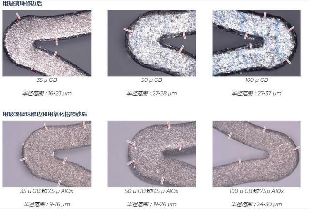 經(jīng)過吉川公司工藝工程師測(cè)試,用氧化鋁砂進(jìn)行定向的噴砂處理可以去除氧化層,平滑表面缺陷并改善外圍支架的表面質(zhì)量。支架的受損區(qū)域很脆,但基礎(chǔ)材料鎳鈦諾卻具有延展性。氧化鋁噴砂磨料使用去氧化層,并且對(duì)韌性基體的侵蝕最小,從而在支架撐桿的整個(gè)長(zhǎng)度上形成均勻的表面光潔度。 市場(chǎng)最新的支架設(shè)計(jì)和醫(yī)療植入物要求更大的邊緣倒圓角。圓形邊緣降低了被植入物卡住,其他風(fēng)險(xiǎn)的可能性。氧化鋁微噴丸的半徑為5-15 m,但新的幾何尺寸指定為接近25 m。該半徑可以通過三種途徑實(shí)現(xiàn):延長(zhǎng)噴砂周期,使用更大尺寸的氧化鋁或完全使用其他磨料。通過測(cè)試,我們了解到更長(zhǎng)的噴砂周期可以去除更多的團(tuán)塊,而較大尺寸的氧化鋁會(huì)產(chǎn)生過于粗糙而無法拋光的表面。畢竟,氧化鋁顆粒的形狀為塊狀,邊緣稍尖。這給了我們一個(gè)可行的選擇:嘗試使用其他類型的磨料。為了克服這一障礙,我們測(cè)試了幾種類型的介質(zhì),發(fā)現(xiàn)用玻璃珠噴砂可以在拐角處形成所需的半徑(最大30 m),而不會(huì)除去設(shè)備的額外質(zhì)量。結(jié)果是氧化鋁的質(zhì)量提高了十倍。經(jīng)過吉川公司工藝工程師的測(cè)試事實(shí)說明了結(jié)果的差異。用氧化鋁噴砂處理過的樣品的半徑僅為8-13 m,而用玻璃珠噴砂處理過的樣品的半徑為24-30 m。 經(jīng)過吉川公司工藝工程師最終測(cè)試事實(shí)證明,最好的心臟支架噴砂工藝需要用氧化鋁砂粗噴砂、再用玻璃珠微噴砂是目前最好的一種噴砂工藝方式。 經(jīng)過粗噴、微噴的產(chǎn)品外徑和內(nèi)徑轉(zhuǎn)角處的半徑可以實(shí)現(xiàn),而所需的附加材料去除最少。半徑的大小可以有效地控制,因?yàn)樗腔趫A形磨料,玻璃珠的大小和速度的??梢钥刂凭哂懈郊影霃降闹Ъ軈^(qū)域。通過機(jī)械加工表面,有助于保持支架的疲勞壽命。玻璃珠磨料通常用于必須保持嚴(yán)格公差的噴丸處理應(yīng)用中。玻璃珠對(duì)支架表面進(jìn)行噴丸處理,不會(huì)去除任何材料或數(shù)量可忽略不計(jì)的材料。如下所示,玻璃珠的尺寸很重要。玻璃珠的尺寸越大;邊緣越圓。玻璃珠有35 ,50 和100 兩種。讓我們看一下使用每種尺寸的樣本測(cè)試的結(jié)果。此處顯示的未噴砂的支架表面(500x)邊緣鋒利,并受到制造損壞。半徑范圍僅為3-8 m。為什么用兩種磨料處理比單獨(dú)用氧化鋁處理好? 玻璃珠無法消除制造過程中產(chǎn)生的浮渣,回彈和其他損壞;只有氧化鋁可以。氧化鋁不能產(chǎn)生真正的圓形邊緣。但是,它確實(shí)可以提供電拋光所需的理想表面光潔度。一個(gè)不能替代另一個(gè)。通過使用多步驟過程,植入物表面可以使用經(jīng)過驗(yàn)證的相同設(shè)備獲得兩全其美的效果。在該過程中添加第二種研磨劑聽起來可能需要更多的勞動(dòng)力,但實(shí)際上比其他修邊過程更有效。例如,電拋光可以產(chǎn)生較大的半徑,但它也會(huì)從整個(gè)零件中去除過多的材料,而不僅僅是角部,從而損害了支架的疲勞壽命。