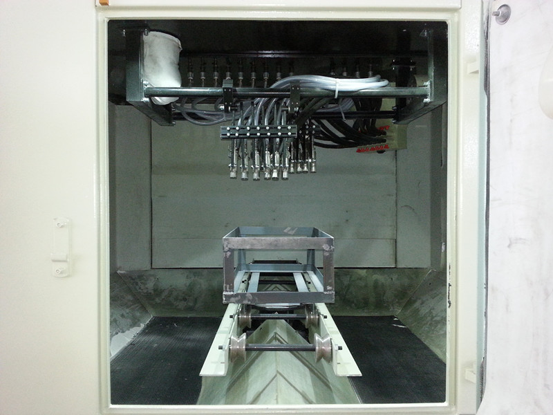 該機(jī)工作方式:將工件套裝在夾具(夾具客戶自制且安放于噴砂機(jī)主機(jī)艙內(nèi)轉(zhuǎn)動(dòng)導(dǎo)軌上)上,推動(dòng)夾具到指定位置,關(guān)閉所有艙門,啟動(dòng)風(fēng)機(jī)后即可開始對工件進(jìn)行噴砂,噴砂時(shí)間結(jié)束(即當(dāng)前工件已加工好),打開艙門,卸出工件;如此循環(huán)。